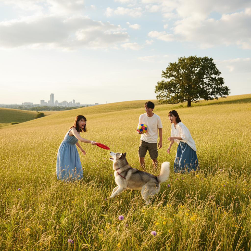 午後からは、近所の公園まで散歩に出かけることにしました。ハスキーは散歩大好きな犬種なので、リードを見せた瞬間のルナの目の輝きといったら、まるで子供のようです。5人で歩く散歩は、まるでピクニックのような楽しい雰囲気でした。