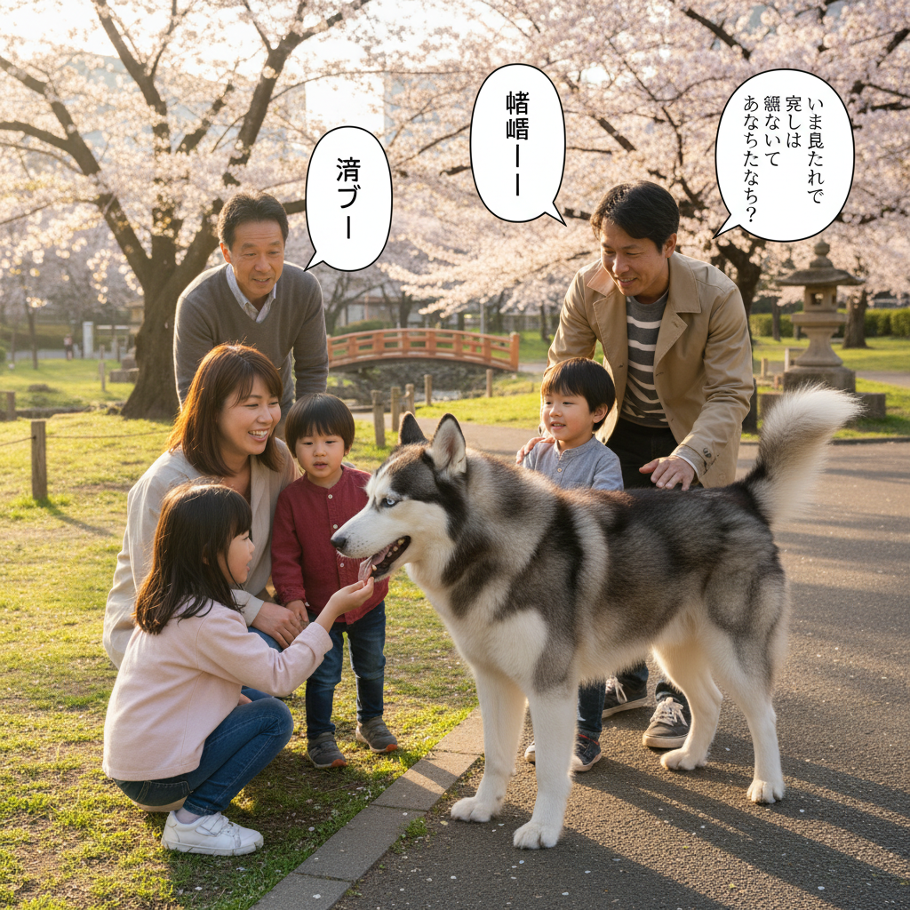 最初の一週間は正直、ちょっと怖かった。あの青い目でじっと見つめられると、何を考えてるのか全然わからなくて、距離感がつかめない。子供が近づくたびにハラハラして、私がいちいち間に入ってた。ネットで調べると「ハスキーは独立心が強い」とか「しつけが難しい」とか出てくるし、夜中に遠吠えの真似みたいな声を出されたときは、ご近所に謝りに行く未来が見えた。
