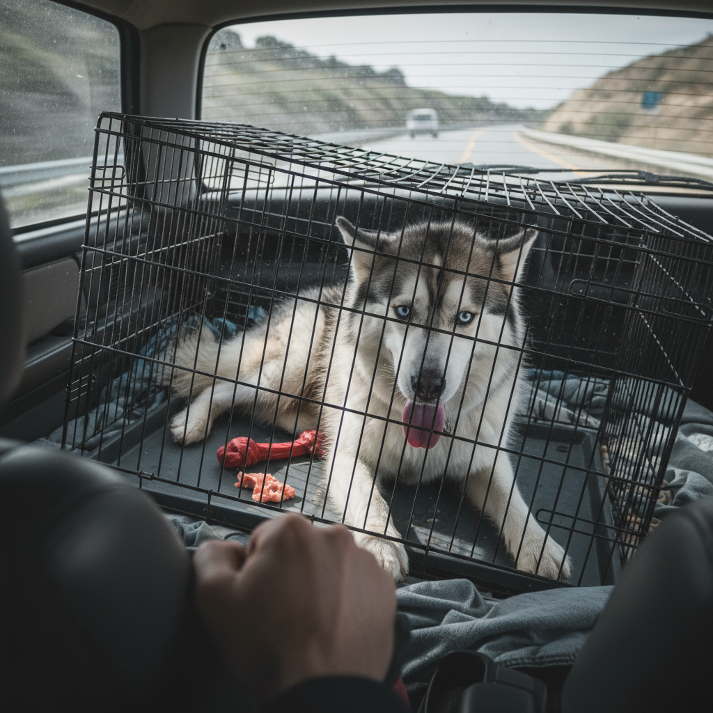 クレートの選び方も最初は適当だった。「入ればいいでしょ」くらいのノリでホームセンターの安いやつを買ったら、カーブのたびにガタガタ音がして、中でハスキーが踏ん張れなくて滑ってた。見てて可哀想になって、結局ちゃんとしたものに買い替えた。サイズは立って方向転換できるくらいがベスト。狭すぎるとストレスだし、広すぎると体が固定できなくて揺れに弱くなる。底に滑り止めマットを敷いて、慣れたタオルとか匂いのついた布を入れておくと落ち着く。クレートを嫌がる子もいるけど、うちの場合は「ここが自分の場所」って認識してからは自分から入るようになった。