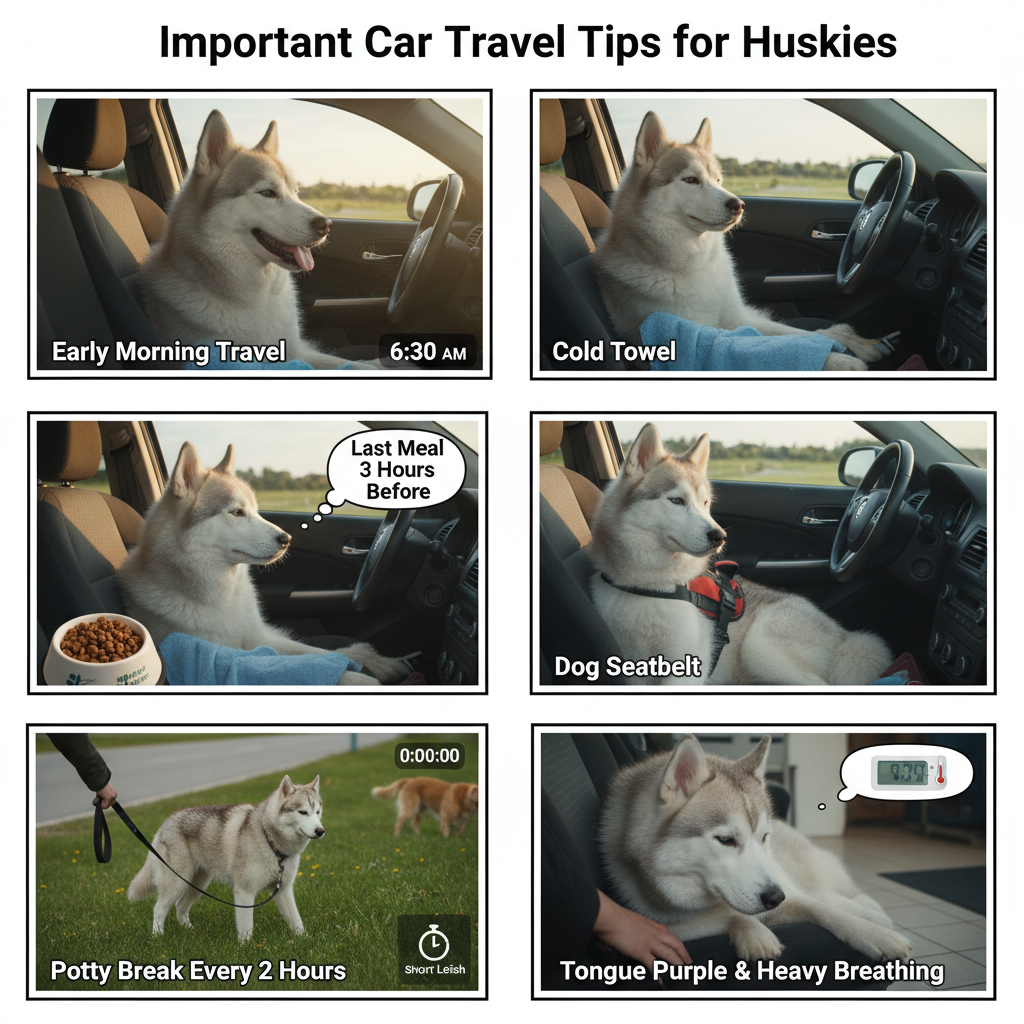 直前にガッツリ食べさせると、車酔いで吐く確率が跳ね上がる。うちは一度それでシートを盛大にやられて、高速のSAで途方に暮れた経験がある。あのときの絶望感ったらなかった。だから今は、出発の最低3時間前には食事を終わらせるようにしてる。水は少しずつ飲ませるけど、がぶ飲みさせないこと。あと、トイレ休憩は2時間に1回が目安かな。ハスキーってけっこう我慢強いから、サイン出さずに限界まで溜め込むタイプが多い。だから時間で区切って強制的に休憩させたほうがいい。